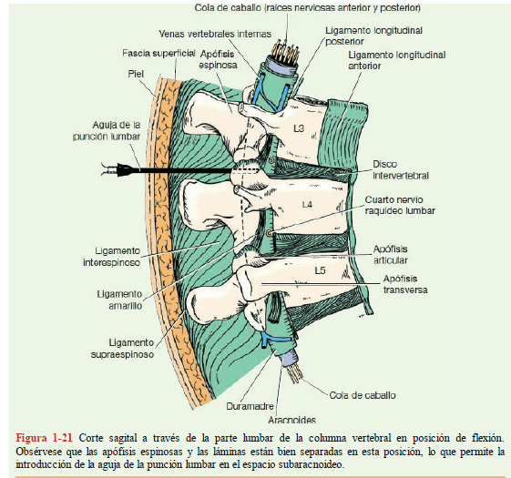 La aguja pasa a través de las siguientes estructuras anatómicas antes de entrar al espacio subaracnoideo: