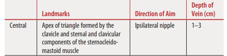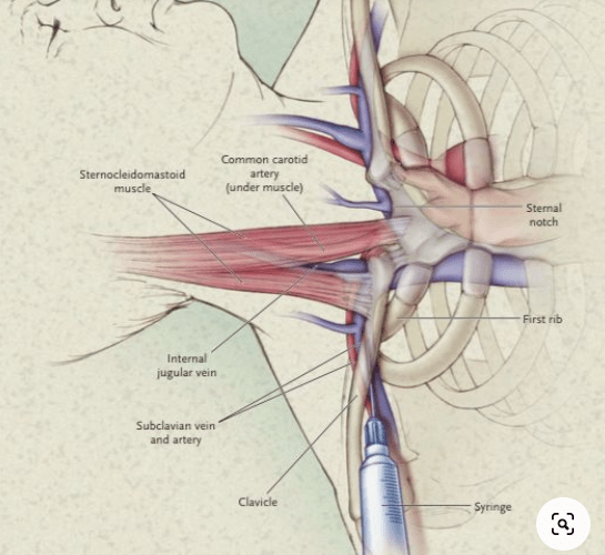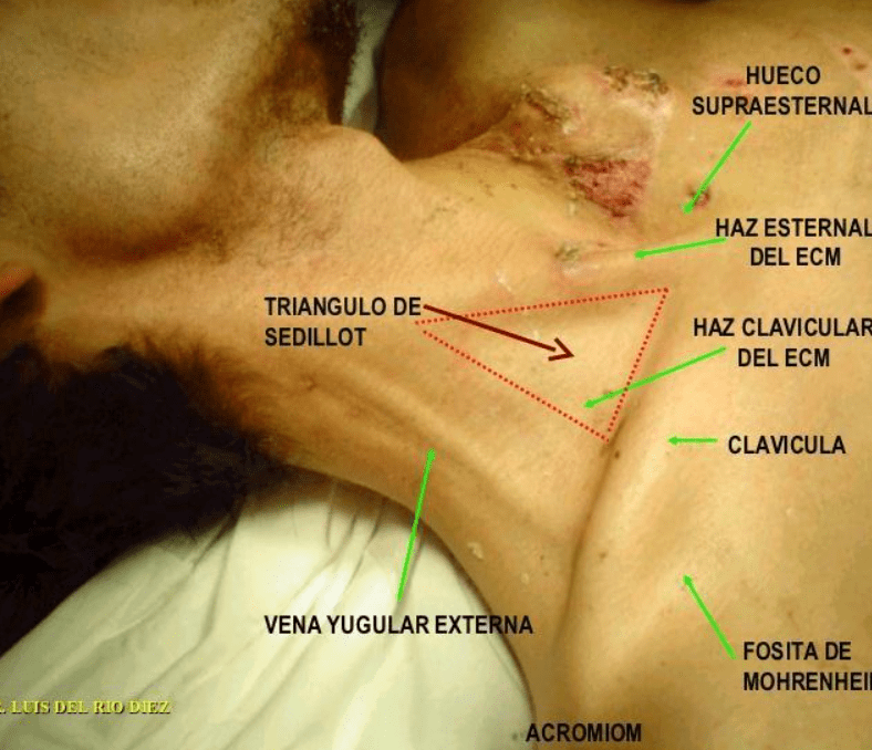 El sitio donde debe penetrar la aguja es en la unión del tercio medio con el inferior del borde lateral (posterior) de ECM, que aproximadamente se encuentra 5 cm arriba de la clavícula, donde la yugular externa cruz a el ECM. La dirección debe apuntar al hueco supraesternal en un ángulo de 45° con respecto a los pIanos sagital y horizontal y a 150 de angulación en el pIano frontal, debiéndose progresar en forma rasante por la cara posterior del músculo antedicho.