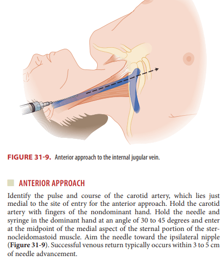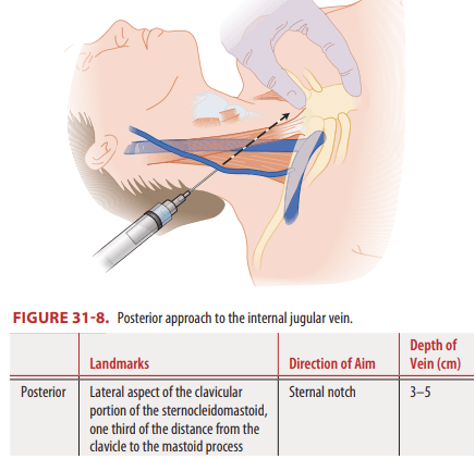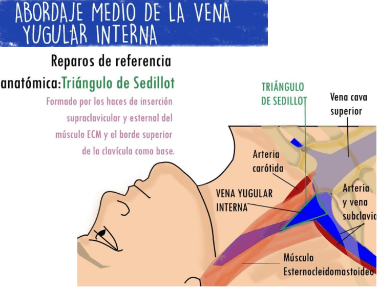 Existen 3 abordajes principales de la vena yugular interna, según su relación con el músculo esernocleidomastoideo : Abordaje Anterior, Central y Posterior.