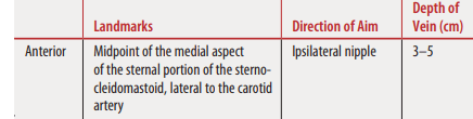 En el punto medio de este triangulo (muy constantepor cierto) y direccionando la punta de la aguja hacia la mamila ipsilateral, con un ángulo de 30º respecto al eje frontal, la vena esalcanzada a escasos centímetros de la piel. El riesgo de punción accidental de la Arteria es menor que en la vía anterior y la comodidadque le da al paciente esta vía es muy aceptada.