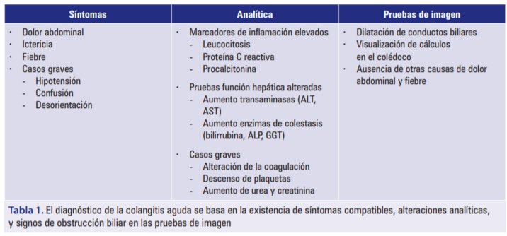 Se basa en una clínica compatible, acompañado comúnmente aumento de transaminasas, fosfatasa alcalina, leucocitosis, hiperbilirrubinemia y alteración de la vía biliar documentada en técnicas de imagen