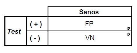Ante un determinado test o estudio diagnóstico, un paciente sano tiene dos posibilidades: tener un resultado positivo (CELDILLA B), lo que lo convierte en un falso positivo (FP), o tener un resultado negativo (CELDILLA D), lo que lo convierte en un verdadero negativo (VN)