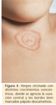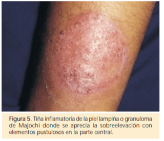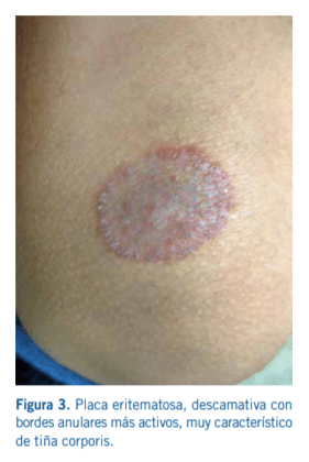 La lesión micótica típica se inicia como una pequeña mácula eritematosa que crece rápidamente en forma centrífuga y forma una placa con bordes netos sobreelevados, con microvesículas que se rompen y dejan escamas pequeñas, con ligera descamación periférica y aclaramiento central con forma de anillo (signo de la escarapela). Sin embargo ésta no es la lesión más frecuente.